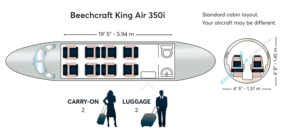 The King Air 350 is a larger version of the 200. It has a further stretched fuselage enabling a cabin for up to 8 passengers in 2 club configuration. Winglets were added to the wingtips to increase range and performance.